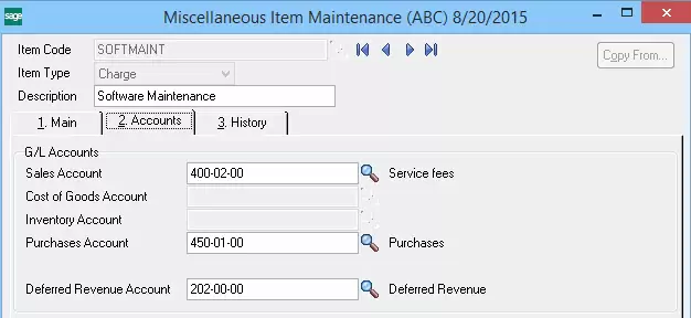 DR_MiscItemGeneral ledger accounts for deferred revenue can be defined by miscellaneous item or by product line when using standard inventory items. ย Additionally the ARDR and SODR enhancements add a new history file to your Sage 100 system to keep track of โ€œfutureโ€ general ledger postings, which allows you to create a Crystal Report for deferred revenue forecasting.