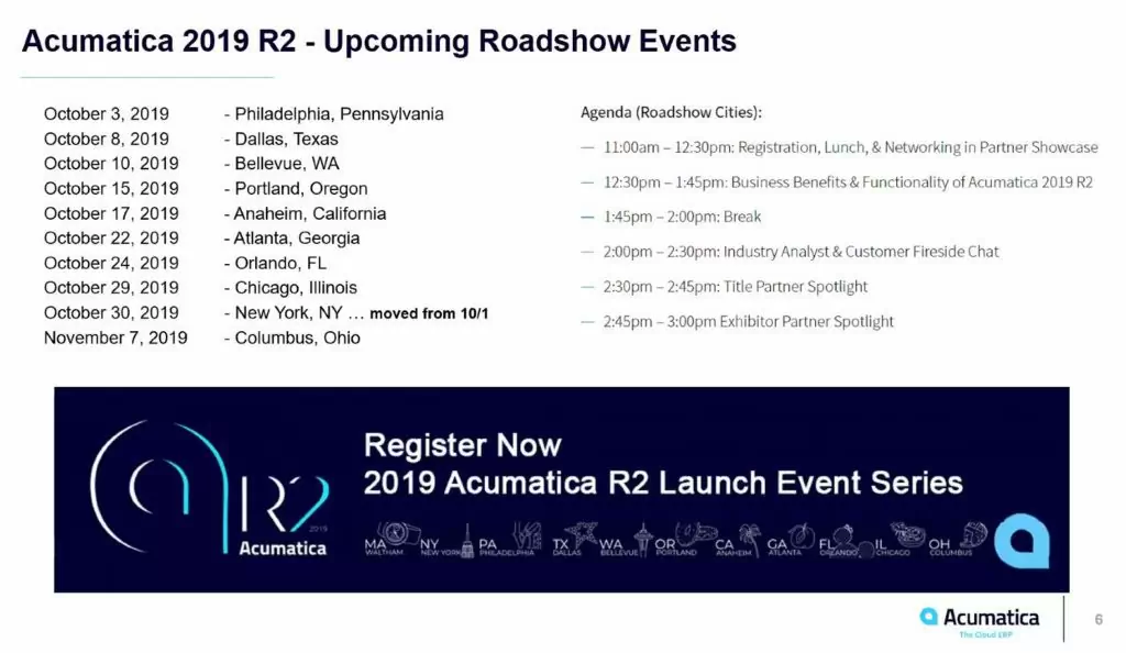 This means that Acumaticaโ€™s annualย Acumatica 2019 R2 Launch Event Seriesย is almost here. The initial Launch Day Event is scheduled for Wednesday, September 11, 2019, in Waltham, Massachusetts, at The Westin Waltham Boston followed by ten Roadshow Events in cities across the U.S. throughout October.