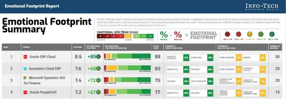 SoftwareReviews found 4 top ERP systems, including Acumatica Cloud ERP, have the highest combined Value Index and Net Emotional Footprint scores across all ERP vendors included in the study.ย