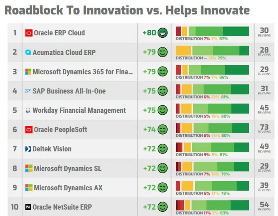 When it comes to being a roadblock to innovating versus helping customers innovate, 14 of the 18 ERP vendors included in the study have a 64% Net Emotional Footprint score. The average across all ranked ERP vendors in the innovation category is 66%. The issue of how much their ERP system enables customers to innovate is a divisive one. A vendor receiving a 54% Net Emotional Footprint score had 89 customer reviews. Conversely, another with a score of 74%, well above the average, had 73 reviews.