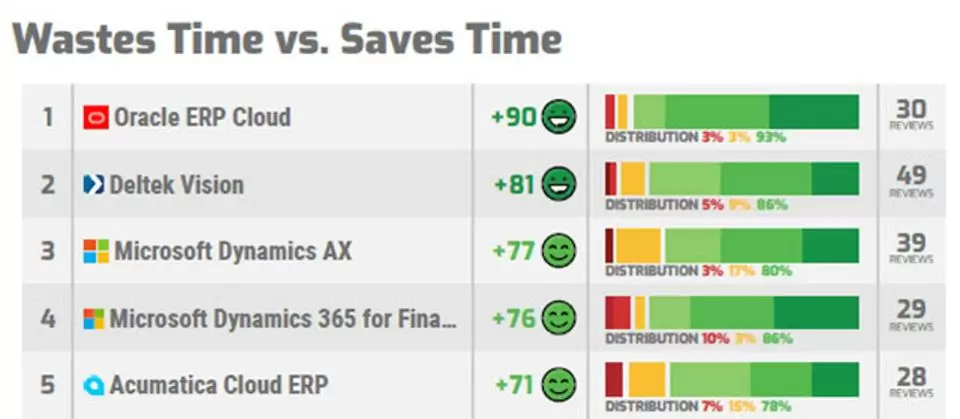 This and many other fascinating insights were uncovered in SoftwareReviewโs latest customer rankings published today in their Emotional Footprint Report on Enterprise Resource Planning. The report is based entirely on attitudinal data captured from verified owners of each ERP system reviewed. A total of 960 customer reviews were completed, evaluating 18 vendors meeting the minimum threshold for publication.