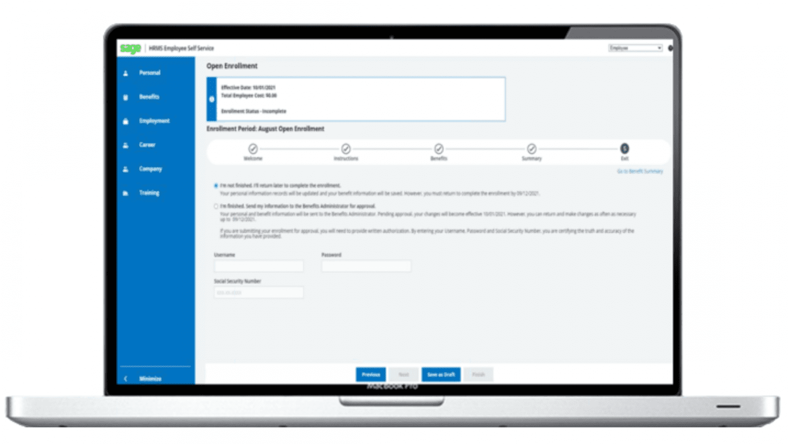 A new Wizard page navigation has been implemented for Life Events and Open Enrollment. You can now see at a glance how many pages youโve completed, where you are, and how much ย you have left. This allows users to see if they have enough time to finish the enrollment right immediately, or save a draft and finish later.