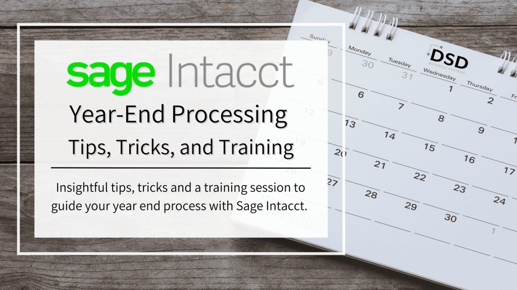 Year-End Processing is here and we want to share some helpful tips, tricks, and checklist with you to help the process go a little smoother. Read on to learn about things like checking for transactions in limbo, closing subledgers, the DSD Month and Year End Closing in Sage Intacct course, and more!ย