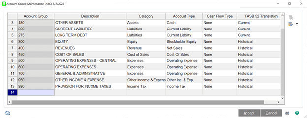 - Assignment of FASB52 Translation method (Historical vs. Current) by Account Group, Main Account, and Account Number levels.