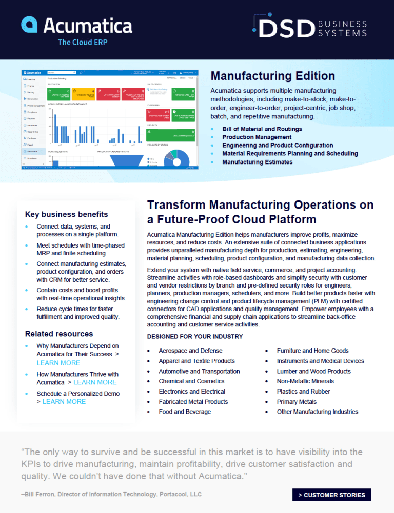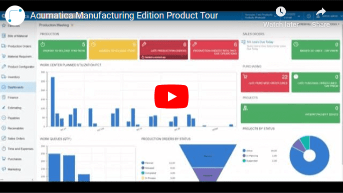 Acumatica Manufacturing Edition helps manufacturers improve profits, maximize resources, and reduce costs. An extensive suite of connected business applications provides unparalleled manufacturing depth for production, estimating, engineering, material planning, scheduling, product configuration, and manufacturing data collection.
