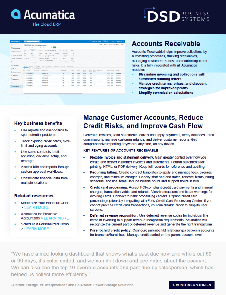 In this Acumatica Financial Management: Accounts Receivable Datasheet, you will learn how Accounts Receivable helps improve collections by automating processes, tracking receivables, managing customer refunds, and controlling credit risks. It is fully integrated with all Acumatica modules, thus making it easy to integrate and use.