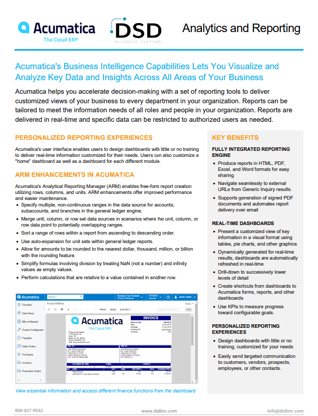 In this Acumatica Analytics and Reporting Datasheet, you will learn how Acumatica’s Business Intelligence Capabilities Lets You Visualize and Analyze Key Data and Insights Across All Areas of Your Business
