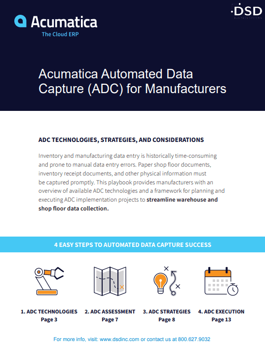 In this Acumatica Automated Data Capture for Manufacturers Datasheet, you will learn that inventory and manufacturing data entry is historically time-consuming and prone to manual data entry errors. Paper shop floor documents, inventory receipt documents, and other physical information must be captured promptly. This playbook provides manufacturers with an overview of available ADC technologies and a framework for planning and executing ADC implementation projects to streamline warehouse and shop floor data collection.