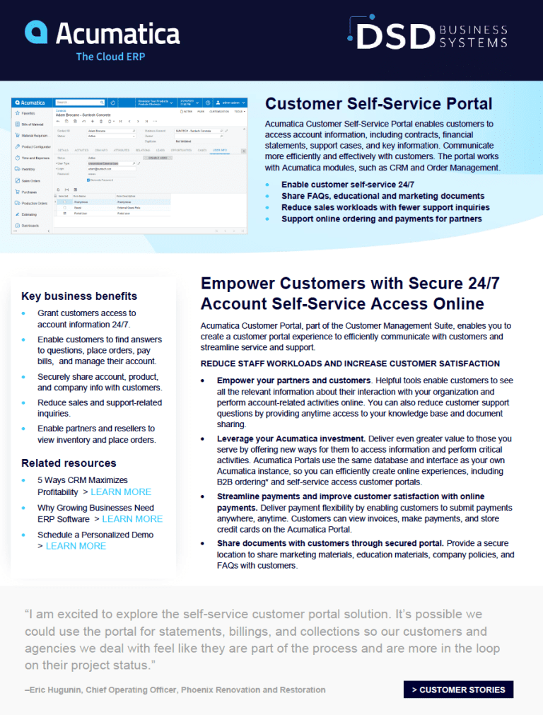 In this Acumatica Customer Self-Service Portal Datasheet, you will learn how Acumatica Customer Self-Service Portal enables customers to access account information, including contracts, financial statements, support cases, and key information. Communicate more efficiently and effectively with customers. The portal works with Acumatica modules, such as CRM and Order Management