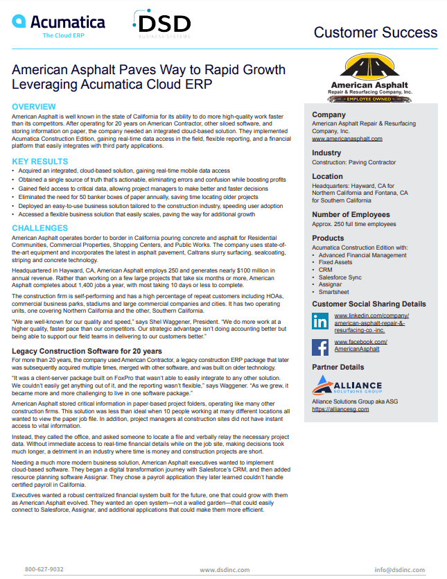 In this Acumatica Construction Success Story, American Asphalt is well known in the state of California for its ability to do more high-quality work faster than its competitors. After operating for 20 years on American Contractor, other siloed software, and storing information on paper, the company needed an integrated cloud-based solution. They implemented Acumatica Construction Edition, gaining real-time data access in the field, flexible reporting, and a financial platform that easily integrates with third party applications.