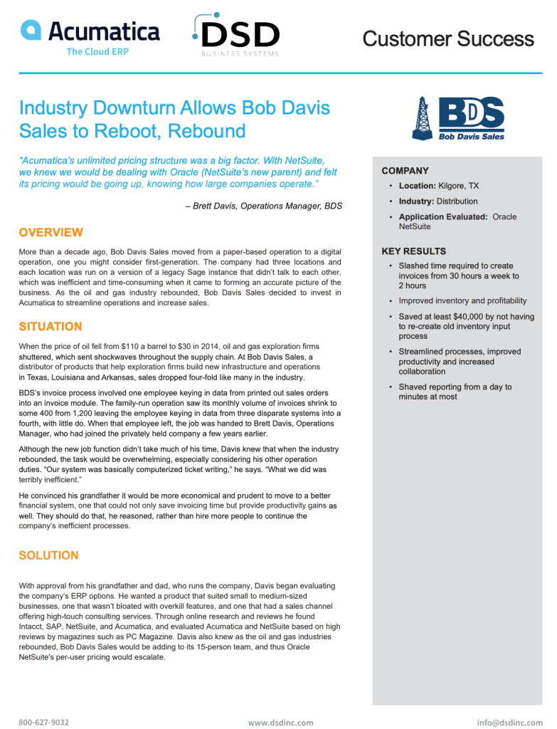 In this Acumatica Customer Success Case Study, more than a decade ago, Bob Davis Sales moved from a paper-based operation to a digital operation, one you might consider first-generation. The company had three locations and each location was run on a version of a legacy Sage instance that didn’t talk to each other, which was inefficient and time-consuming when it came to forming an accurate picture of the business. As the oil and gas industry rebounded, Bob Davis Sales decided to invest in Acumatica to streamline operations and increase sales.