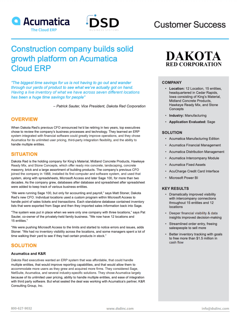 In this Acumatica Customer Growth Story, Dakota Red’s previous CFO announced he’d be retiring in two years. Therefore, top executives chose to review the company’s business processes and technology. They learned an ERP system integrated with financial software could greatly improve operations, and they chose Acumatica for its unlimited user pricing, third-party integration flexibility, and the ability to handle multiple entities.