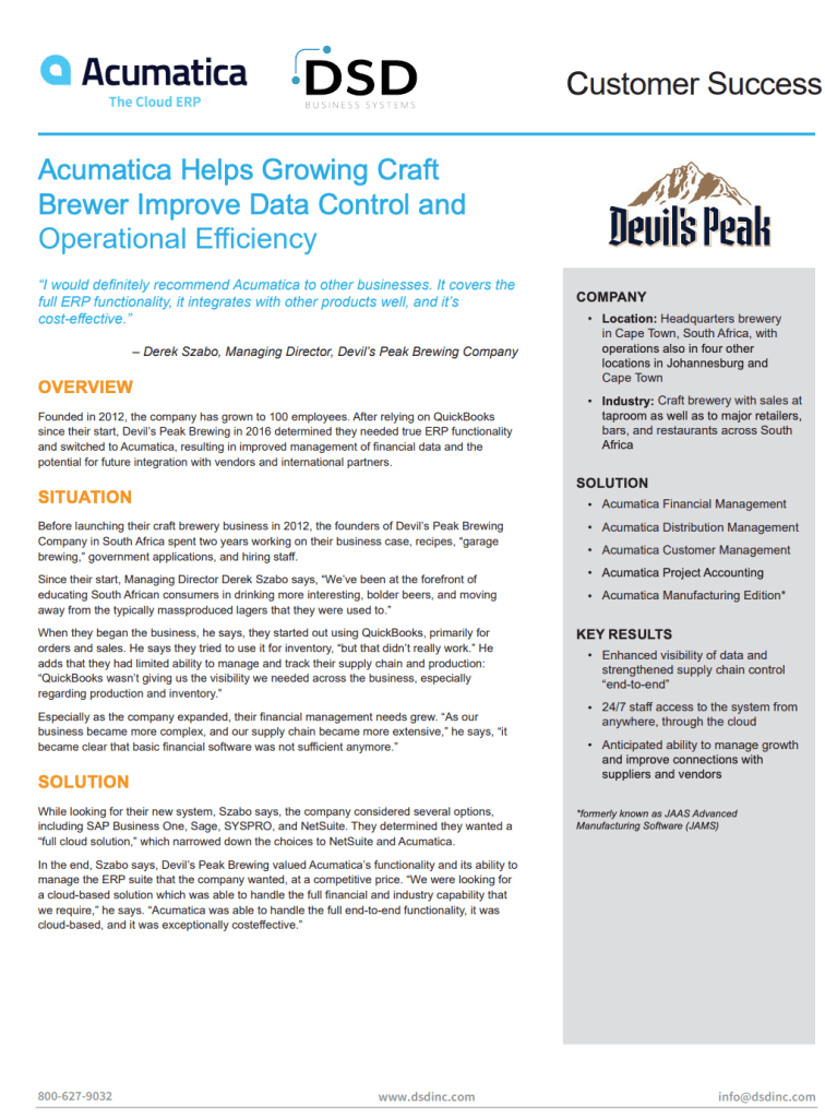 In this Acumatica Customer Success Case Study, Devil’s Peak Brewing Company was relying on QuickBooks since their start. Devil’s Peak Brewing in 2016 determined they needed true ERP functionality and switched to Acumatica, resulting in improved management of financial data and the potential for future integration with vendors and international partners.