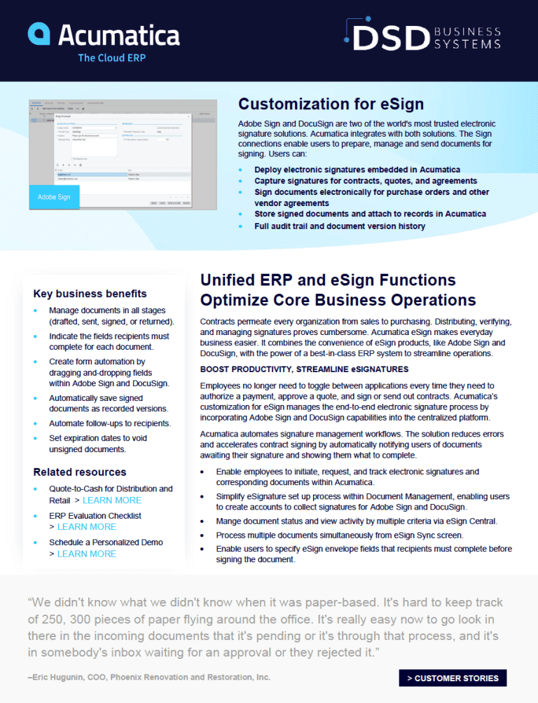 Contracts permeate every organization from sales to purchasing. Distributing, verifying, and managing signatures proves cumbersome. Acumatica eSign makes everyday business easier. It combines the convenience of eSign products, like Adobe Sign and DocuSign, with the power of a best-in-class ERP system to streamline operations.