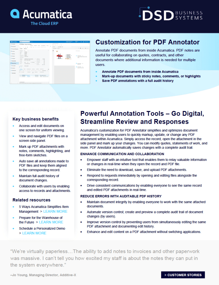 In this Acumatica Customization for PDF Annotator Datasheet, you will learn how Acumatica can Annotate PDF documents from inside Acumatica. PDF notes are useful for collaborating on quotes, contracts, and other documents where additional information is needed for multiple users.