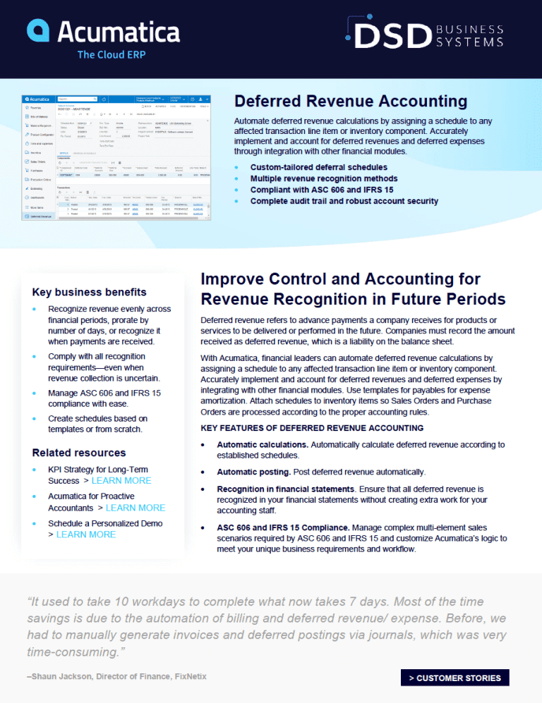 In this Acumatica Deferred Revenue Accounting Datasheet, learn how Automate deferred revenue calculations by assigning a schedule to any affected transaction line item or inventory component. Accurately implement and account for deferred revenues and deferred expenses through integration with other financial modules.