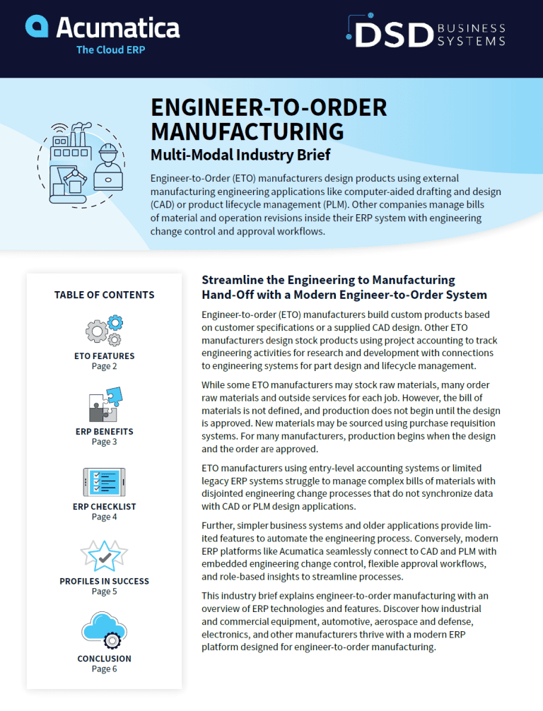 In this Acumatica Engineer-To-Order Manufacturing eBook, you will learn how Engineer-to-Order (ETO) manufacturers design products using external manufacturing engineering applications like computer-aided drafting and design (CAD) or product lifecycle management (PLM). Other companies manage bills of material and operation revisions inside their ERP system with engineering change control and approval workflows.