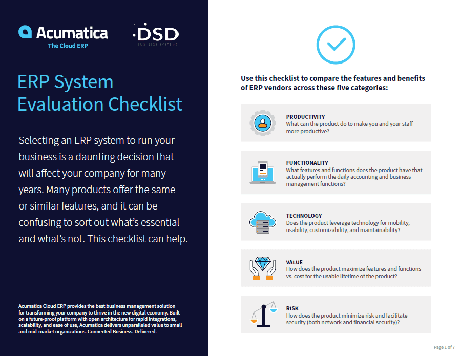 In this Acumatica ERP System Evaluation Checklist, you will learn how selecting an ERP system to run your business is a daunting decision that will affect your company for many years. Many products offer the same or similar features, and it can be confusing to sort out what’s essential