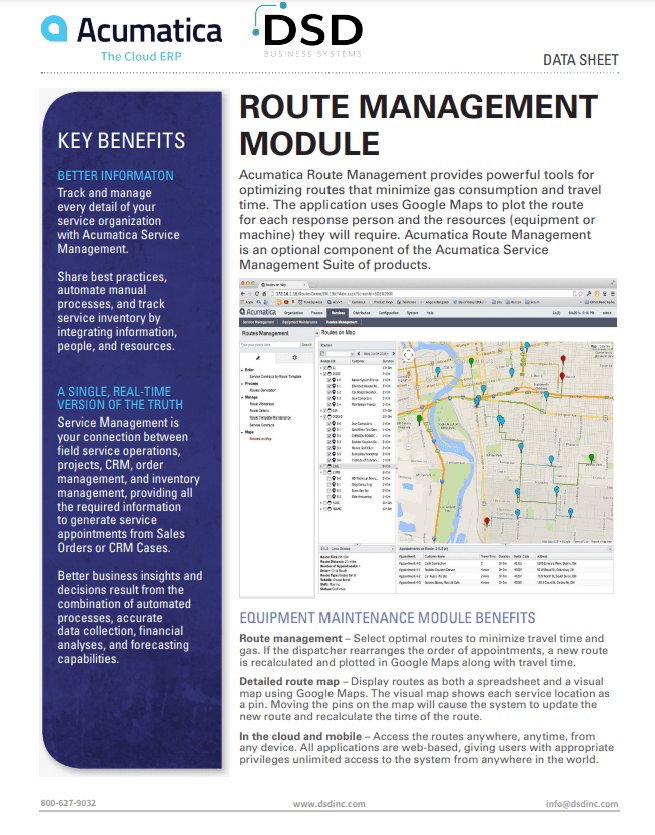 In this Acumatica Field Service route Management Brochure, you will learn how Acumatica Route Management provides powerful tools for optimizing routes that minimize gas consumption and travel time. The application uses Google Maps to plot the route for each response person and the resources (equipment or machine) they will require. Acumatica Route Management