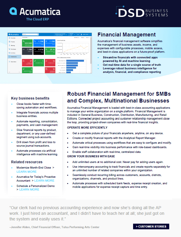 In this Acumatica Financial Management Datasheet, you will learn how Acumatica’s financial management software simplifies the management of business assets, income, and expenses with configurable processes, mobile access, and best-in-class applications on a future-proof platform.