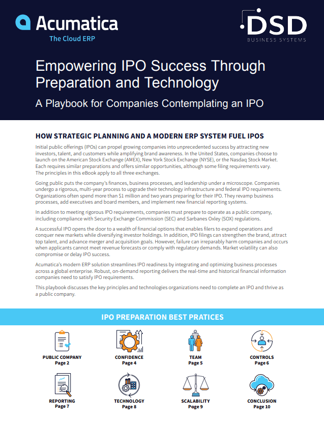 Acumatica’s modern ERP solution streamlines IPO readiness by integrating and optimizing business processes across a global enterprise. Robust, on-demand reporting delivers the real-time and historical financial information companies need to satisfy IPO requirements.
