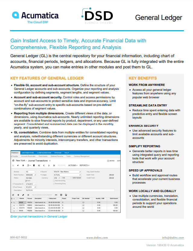 In this Acumatica Financial Management General Ledger Datasheet, you will learn how General Ledger (GL) is the central repository for your financial information, including chart of
