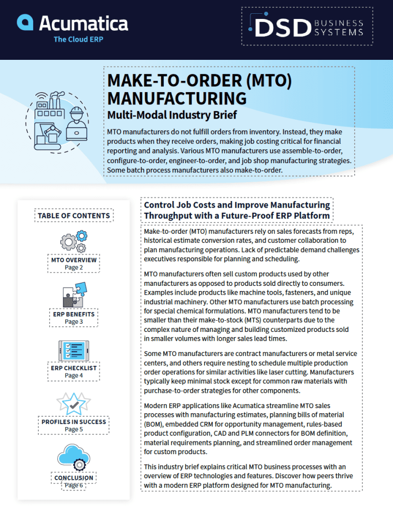 In this Acumatica Make-To-Order Manufacturing brief, you will learn how Make-to-order (MTO) manufacturers rely on sales forecasts from reps, historical estimate conversion rates, and customer collaboration to plan manufacturing operations. Lack of predictable demand challenges executives responsible for planning and scheduling.
