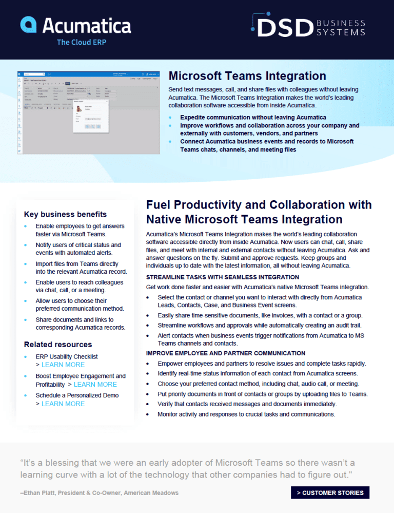 In this Acumatica Microsoft Teams Integration Datasheet, you will learn how Send text messages, call, and share files with colleagues without leaving Acumatica. The Microsoft Teams Integration makes the world’s leading collaboration software accessible from inside Acumatica.