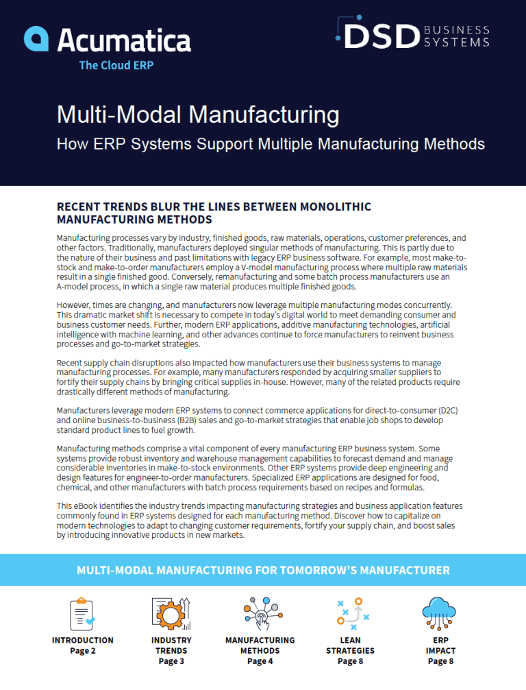 There are no limits to what your company may do after you’ve found the best ERP system for Multi-Modal Manufacturing. This datasheet can help you learn more about how Acumatica can help Boost sales, maximize resources, automate business processes, and improve profits with best-in-class applications for production, estimating, engineering, material planning, scheduling, product configuration, and manufacturing data collection.
