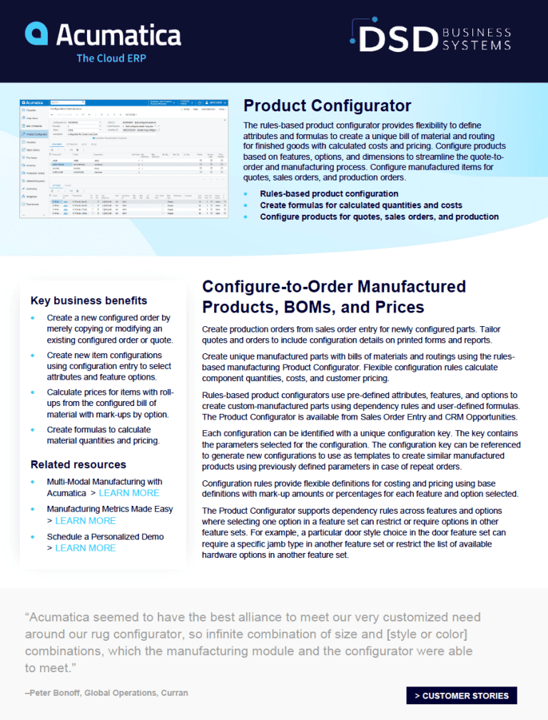 In this Acumatica Product Configurator Datasheet you will learn how the rules-based product configurator provides flexibility to define attributes and formulas to create a unique bill of material and routing for finished goods with calculated costs and pricing. Configure products based on features, options, and dimensions to streamline the quote-toorder and manufacturing process. Configure manufactured items for quotes, sales orders, and production orders.