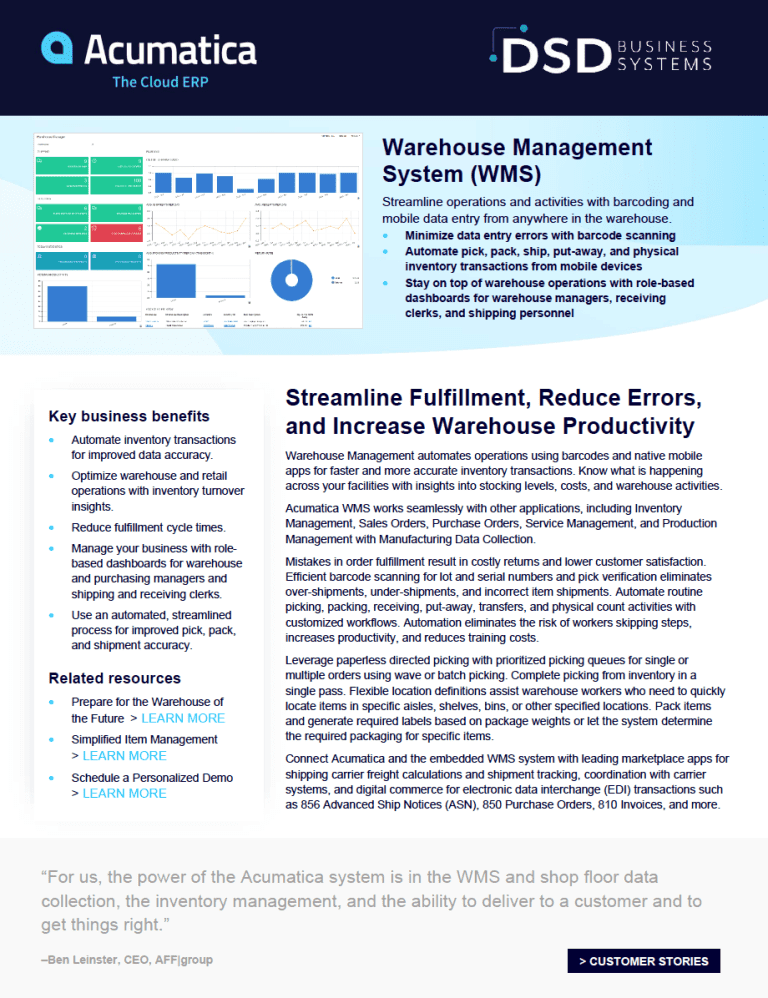 Warehouse Management automates operations using barcodes and native mobile apps for faster and more accurate inventory transactions. Know what is happening across your facilities with insights into stocking levels, costs, and warehouse activities. Acumatica WMS works seamlessly with other applications, including Inventory Management, Sales Orders, Purchase Orders, Service Management, and Production Management with Manufacturing Data Collection.
