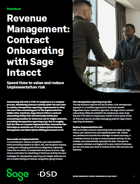 In this Contracting Onboarding with Sage Intacct Datasheet, you will learn that automating ASC 606 or IFRS-15 compliance is a complex process. Rebuilding contract activity under the new rules to satisfy retrospective reporting requirements is often the most time consuming part of the implementation. Unlike other solutions, Sage Intacct offers a contract onboarding utility that automatically builds your accounting baseline for historical and in-flight contracts, providing retrospective reporting at go-live in roughly half the time of a manual implementation. Innovation like this helps us maintain our #1 in Subscription Revenue Management and Subscription Billing placement on G2.