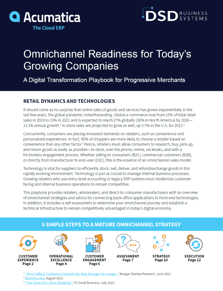 Growing retailers who use entry-level accounting or legacy ERP systems must modernize customerfacing and internal business operations to remain competitive. This playbook provides retailers, wholesalers, and direct-to-consumer manufacturers with an overview of omnichannel strategies and advice for connecting back-office applications to front-end technologies.