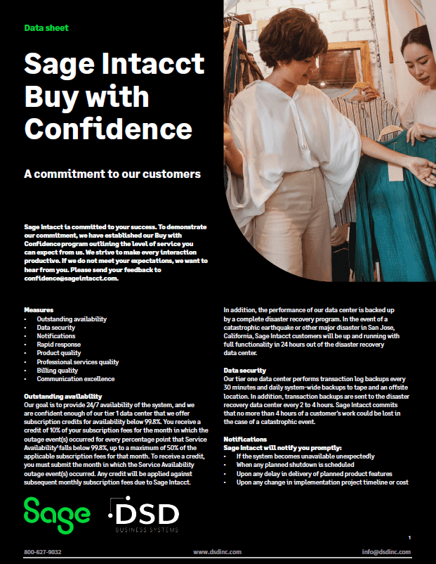 In this Sage Intacct Security Measures Datasheet, you’ll learn about the Buy with Confidence program outlining the level of service you can expect from us. We strive to make every interaction