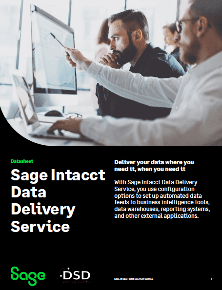 In this Sage Intacct Data Delivery Service Datasheet, you will learn that with Sage Intacct Data Delivery Service, you use configuration options to set up automated data feeds to business intelligence tools, data warehouses, reporting systems, and other external applications.