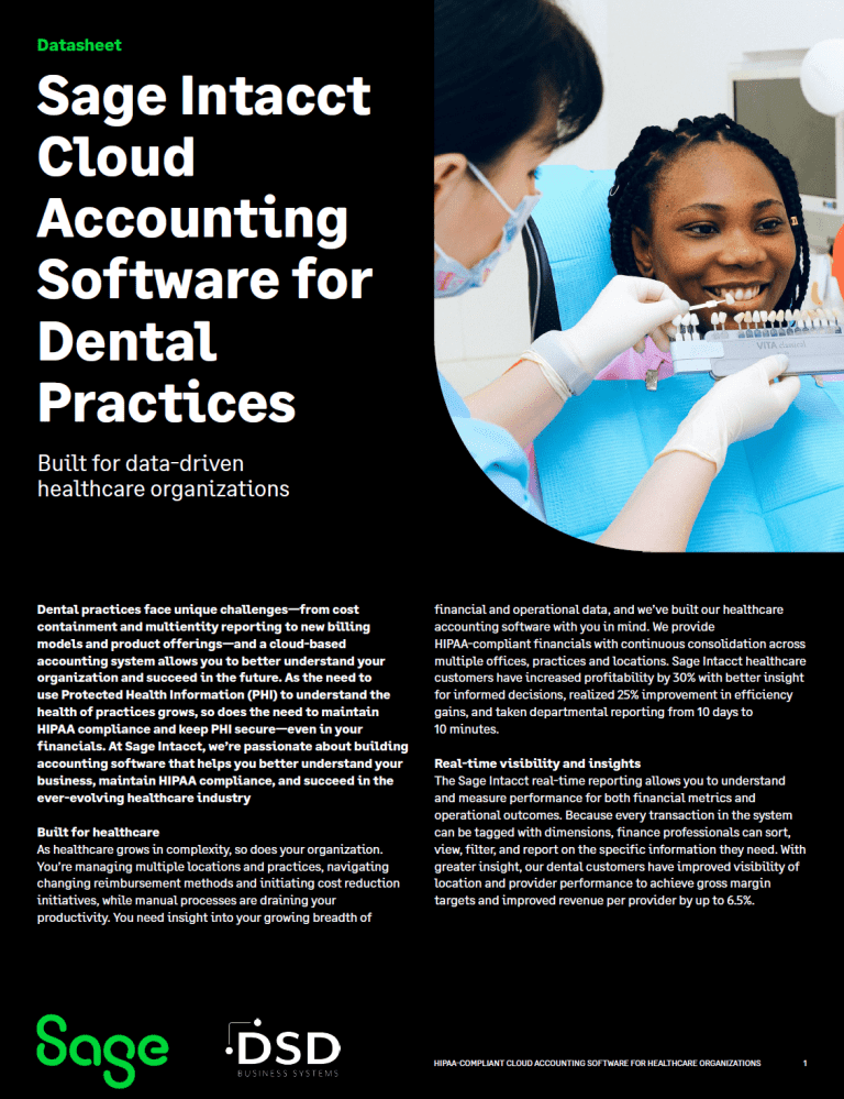 In this Sage Intacct for Dental Practices Datasheet, you will learn Dental practices face unique challenges—from cost containment and multientity reporting to new billing models and product offerings—and a cloud-based accounting system allows you to better understand your organization and succeed in the future. As the need to use Protected Health Information (PHI) to understand the health of practices grows, so does the need to maintain HIPAA compliance and keep PHI secure—even in your financials.