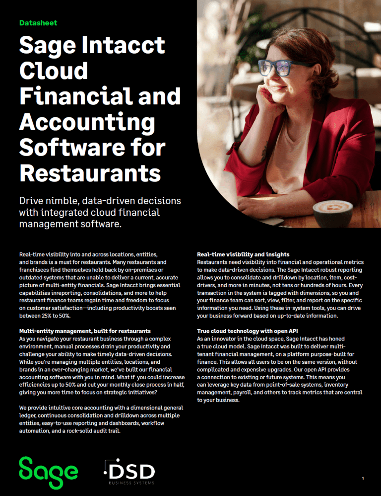 In this Sage Intacct for Restaurants Datasheet, you will learn that real-time visibility into and across locations, entities, and brands is a must for restaurants. Many restaurants and franchisees find themselves held back by on-premises or outdated systems that are unable to deliver a current, accurate picture of multi-entity financials. Sage Intacct brings essential capabilities inreporting, consolidations, and more to help restaurant finance teams regain time and freedom to focus on customer satisfaction.