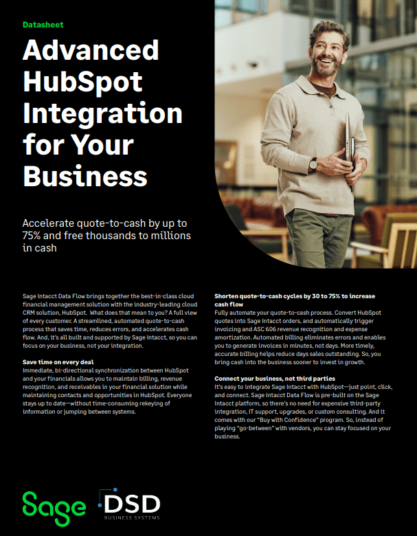 The Advanced HubSpot Integration for Your Business datasheet showcases how Sage Intacct Data Flow seamlessly integrates best-in-class cloud financial management with HubSpot, the leading cloud CRM solution. This integration provides a comprehensive view of every customer and automates the quote-to-cash process, significantly reducing errors and accelerating cash flow. Built and supported by Sage Intacct, this solution allows businesses to focus on growth rather than managing complex integrations.
