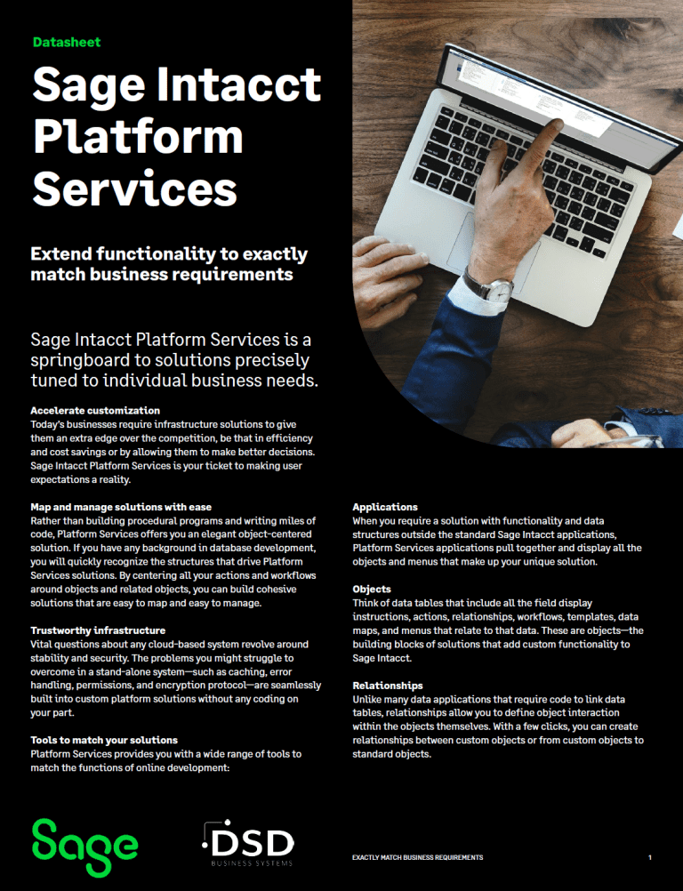 In this Sage Intacct Platform Services Datasheet, you will learn today’s businesses require infrastructure solutions to give them an extra edge over the competition, be that inefficiency and cost savings or by allowing them to make better decisions. Sage Intacct Platform Services is your ticket to making user expectations a reality.