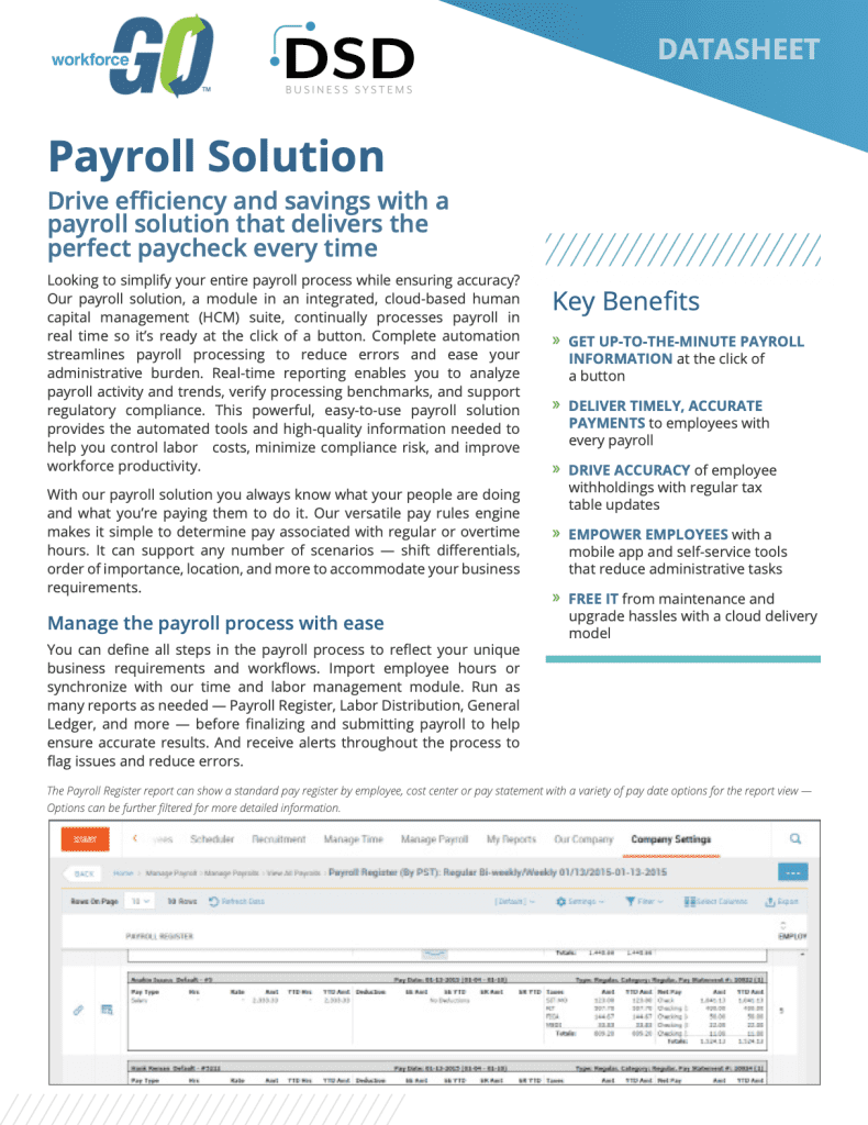 In this Workforce Go Payroll Datasheet, you will learn that our payroll solution, a module in an integrated, cloud-based human capital management (HCM) suite, continually processes payroll in real time so it’s ready at the click of a button. Complete automation streamlines payroll processing to reduce errors and ease your administrative burden. Real-time reporting enables you to analyze payroll activity and trends, verify processing benchmarks, and support regulatory compliance. This powerful, easy-to-use payroll solution provides the automated tools and high-quality information needed to help you control labor costs, minimize compliance risk, and improve workforce productivity.