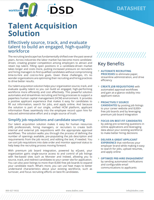 In this Workforce Go Talent Acquisition Datasheet, you will learn that the recruiting landscape has fundamentally shifted over the past several years. Across industries the labor market has become more candidate driven, creating greater competition among employers to attract and retain top talent. Filling open positions in a candidate-driven market takes longer and costs more, putting increased pressure on recruiters and hiring managers to find qualified candidates without compromising time-to-hire and cost-to-hire goals. Given these challenges, it’s no wonder organizations are optimizing their recruiting and hiring practices to drive better results.