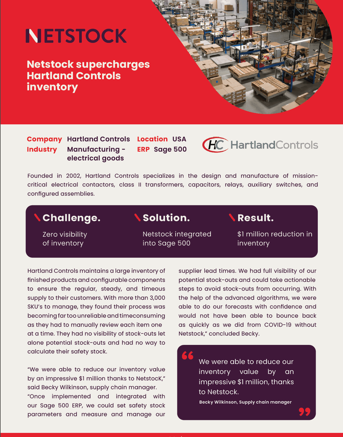 Netstock unlocks the supply chain data in your Sage ERP system by extracting and analyzing it to provide prescriptive recommendations, enabling smart supply chain planning decisions for your business. Netstock seamlessly integrates with Sage X3, Sage 300, and Sage 100 ERPs.