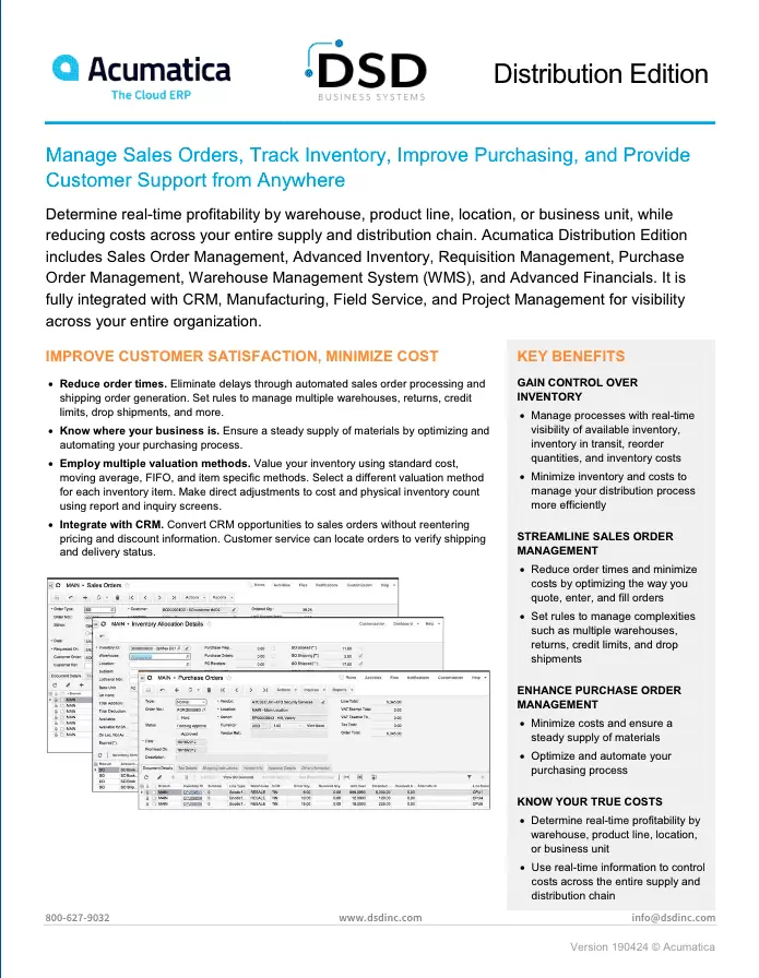 Acumatica Wholesale Distribution ERP Software can help you manage sales orders, track inventory, fill orders, improve purchasing, and provide customer support from anywhere with with distribution management software that is fully integrated with Acumatica’s CRM, Financials, Manufacturing, and Project Management for visibility across the entire organization.