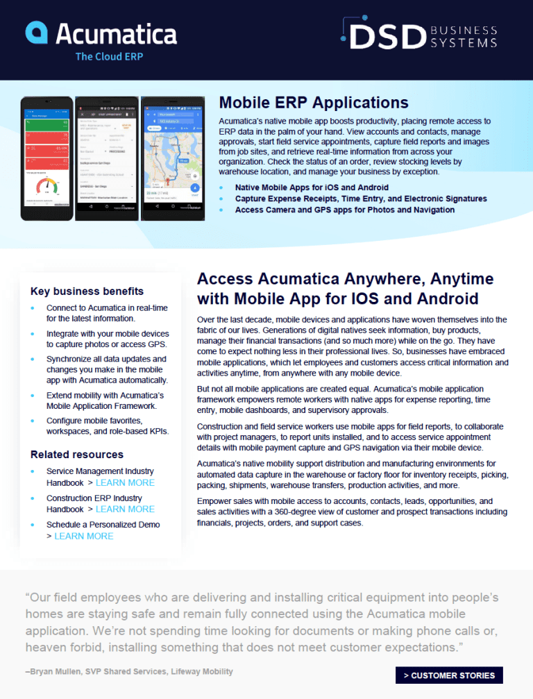 Acumatica allows remote access using the iOS Apple Store and Android native app or using any web browser on any device. Acumatica offers dedicated apps for mobile CRM, mobile sales orders, project time cards, and more. For more detailed information, view the data sheet.