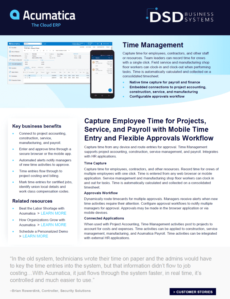 Time Management enables flexible approval workflows and mobile time entry to capture employee/crew time for service, projects, and payroll.