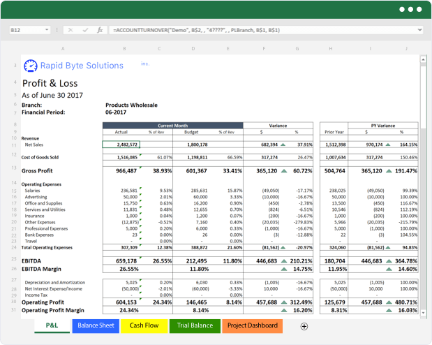 You don’t have to think about which tables or queries to use. Our pre-packaged Project functions are simple Excel-based functions that retrieve all your Project balances, budgets, committed amounts and quantities, as well as other information related to projects and tasks directly from your ERP.